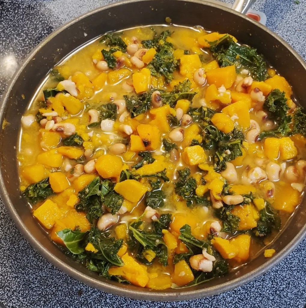 Checking off the protein list: sweet potatoes – check! Kale – check! Black-eyed peas – check, check, check!